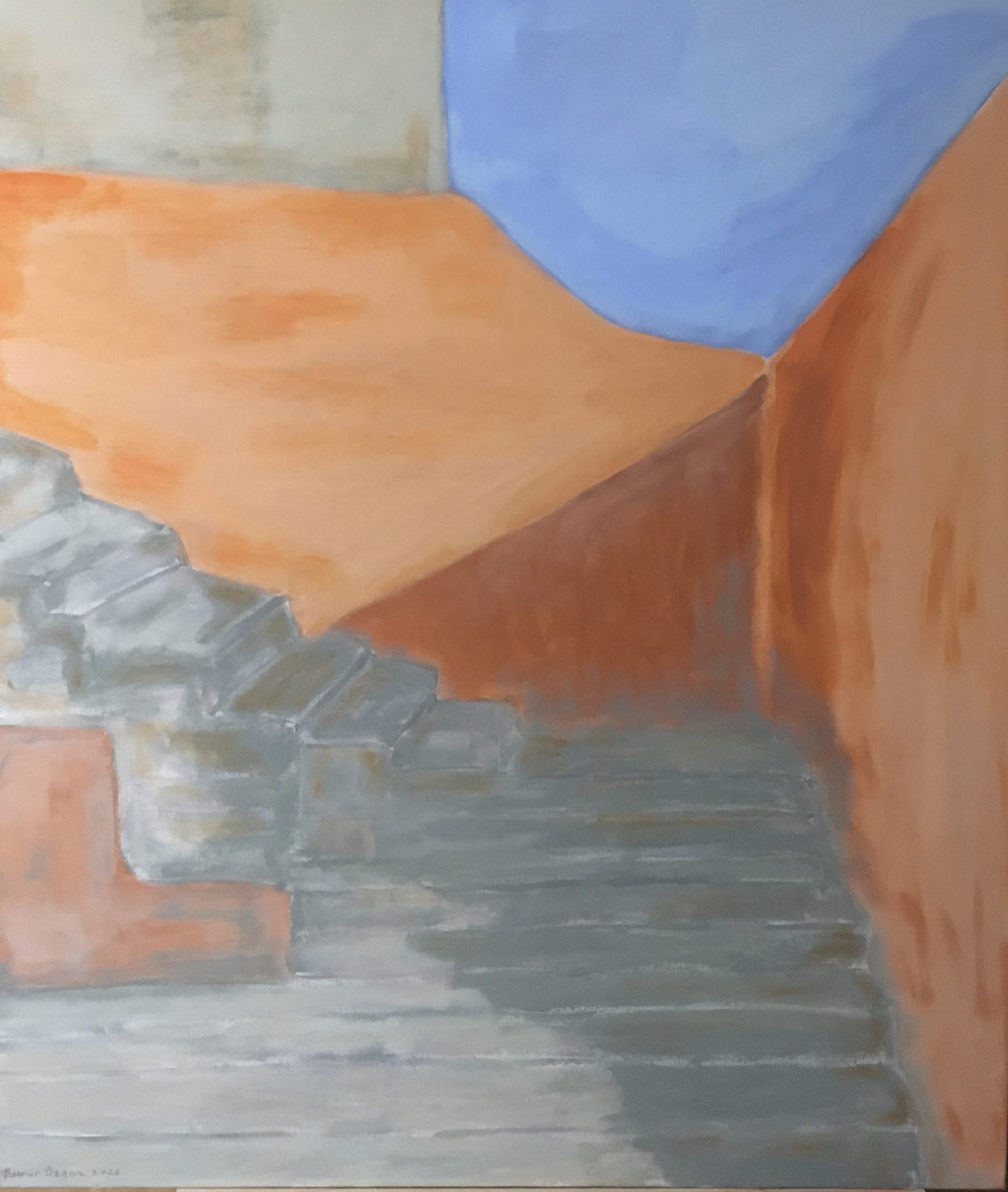 Bu eser, Akdeniz ışığı altında şekillenen mimari yüzeylere odaklanır ve bilinçli olarak çarpıtılmış bir perspektif sunar. Duvarlar, merdivenler ve gökyüzü fiziksel alanı değil, algısal gerilimi temsil eder.