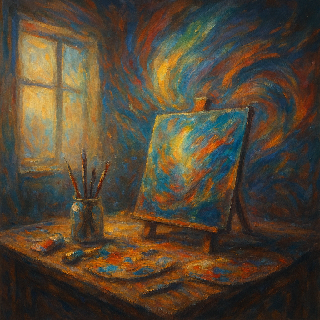 Atölye, bir oda değil; bir evren çatlağıdır. Fırçalar, renkler, kağıtlar – hepsi kendi ruhuyla yaşar. Masanın dağınıklığı bile nefes alır; orada her şey sessiz bir dil konuşur. Sanatçı dokundukça canlanan, baktıkça büyüyen bir evren kurar. Sanki elleri değil, ruhunun kıvrımları çalışıyordur.