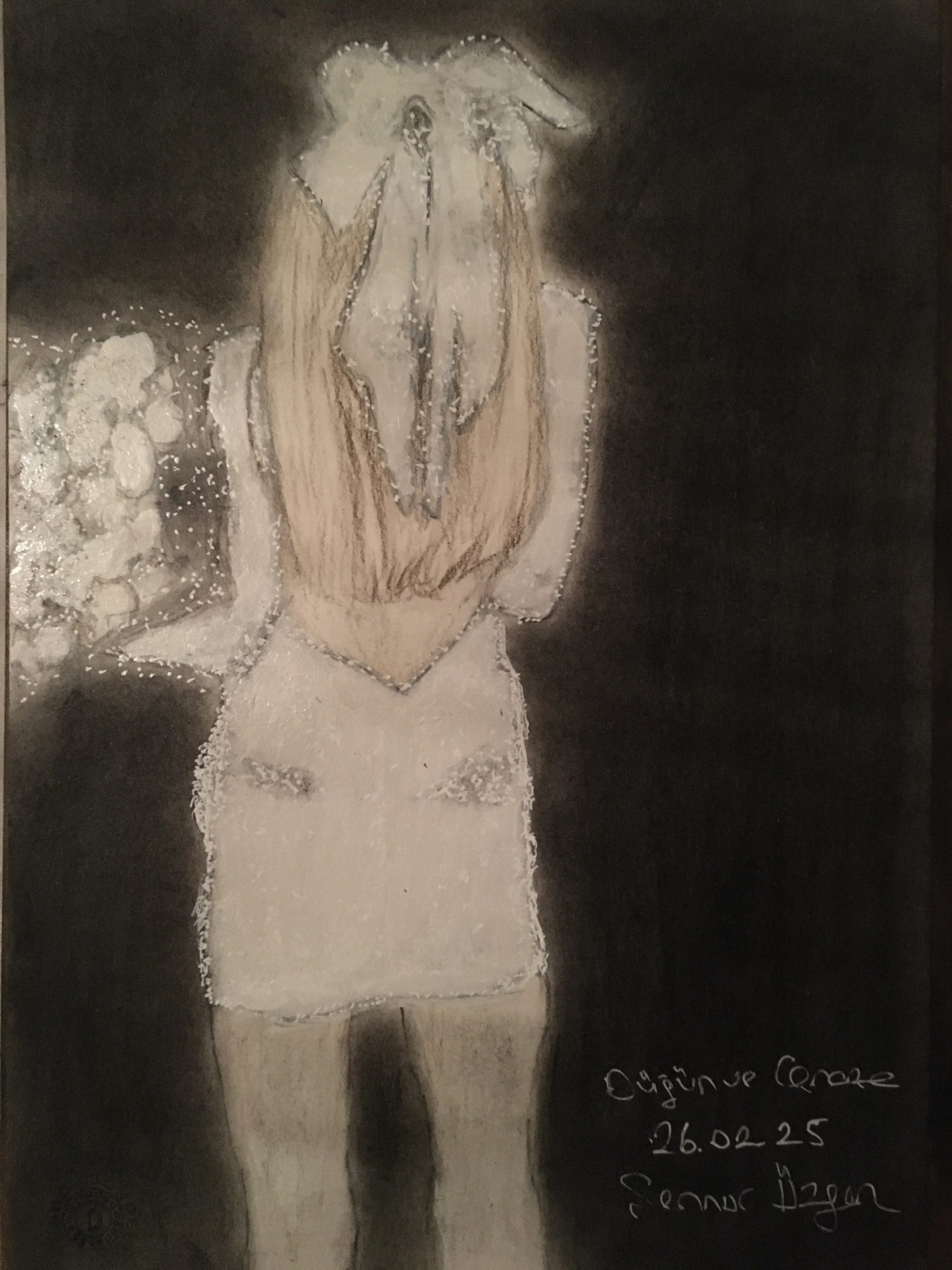 “Beyaz elbisesiyle gelin, sırtını dönmüş dünyaya. Elinde tuttuğu çiçekler, sevinçle hüznün ince çizgisinde sallanıyor. Koyu fonun gölgesinde beyaz çiçekler bir umut ışığı gibi parlıyor; düğün ve cenaze, aynı anda bir nefeste buluşuyor.”